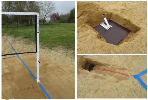 - Lignes de court : Rubans unicolores en matériau résistant. Comprend des chevilles métalliques pour fixer fermement les lignes au sol. Deux lignes latérales de 16m, deux lignes de base de 6m et deux lignes de zone morte de 6m.
